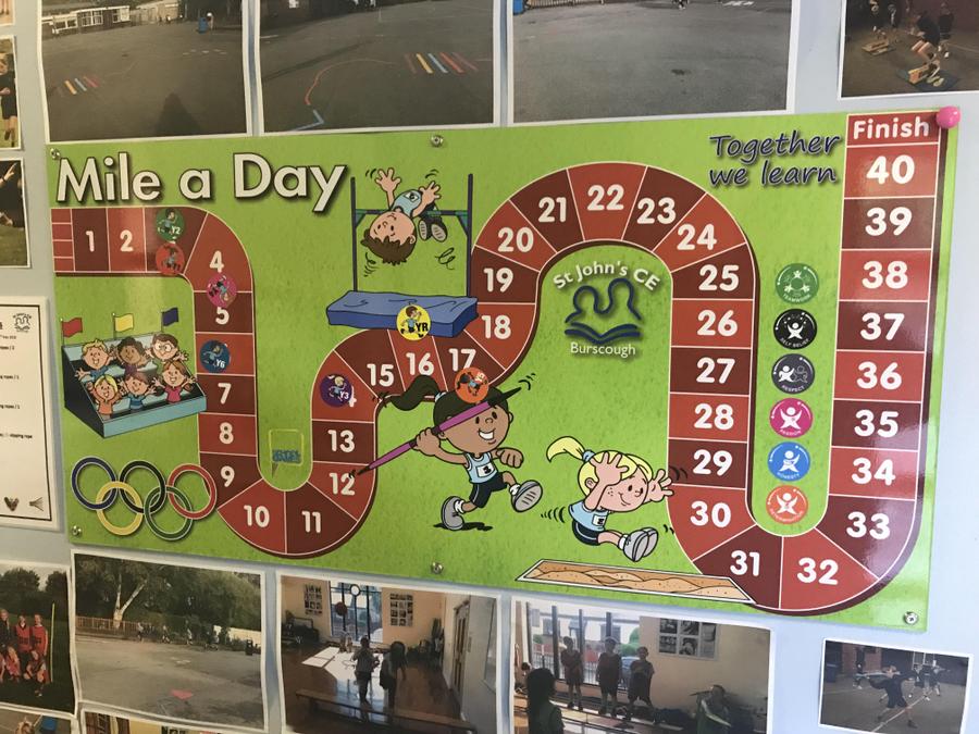 At St Johns CE we love doing the daily mile. The daily mile scheme is to encourage children to be active in line with the governments guideline of the active 30:30 with 30 minutes of exercise done in school each day and the other 30 minutes to be done at home whether that is running, walking or cycling being active is the key. We also have a Mile a Day board which is a challenge between each class to see who can do the most miles in each half term. The winning infant class and the winning junior class get a goodie bag with lots of playtime equipment in.